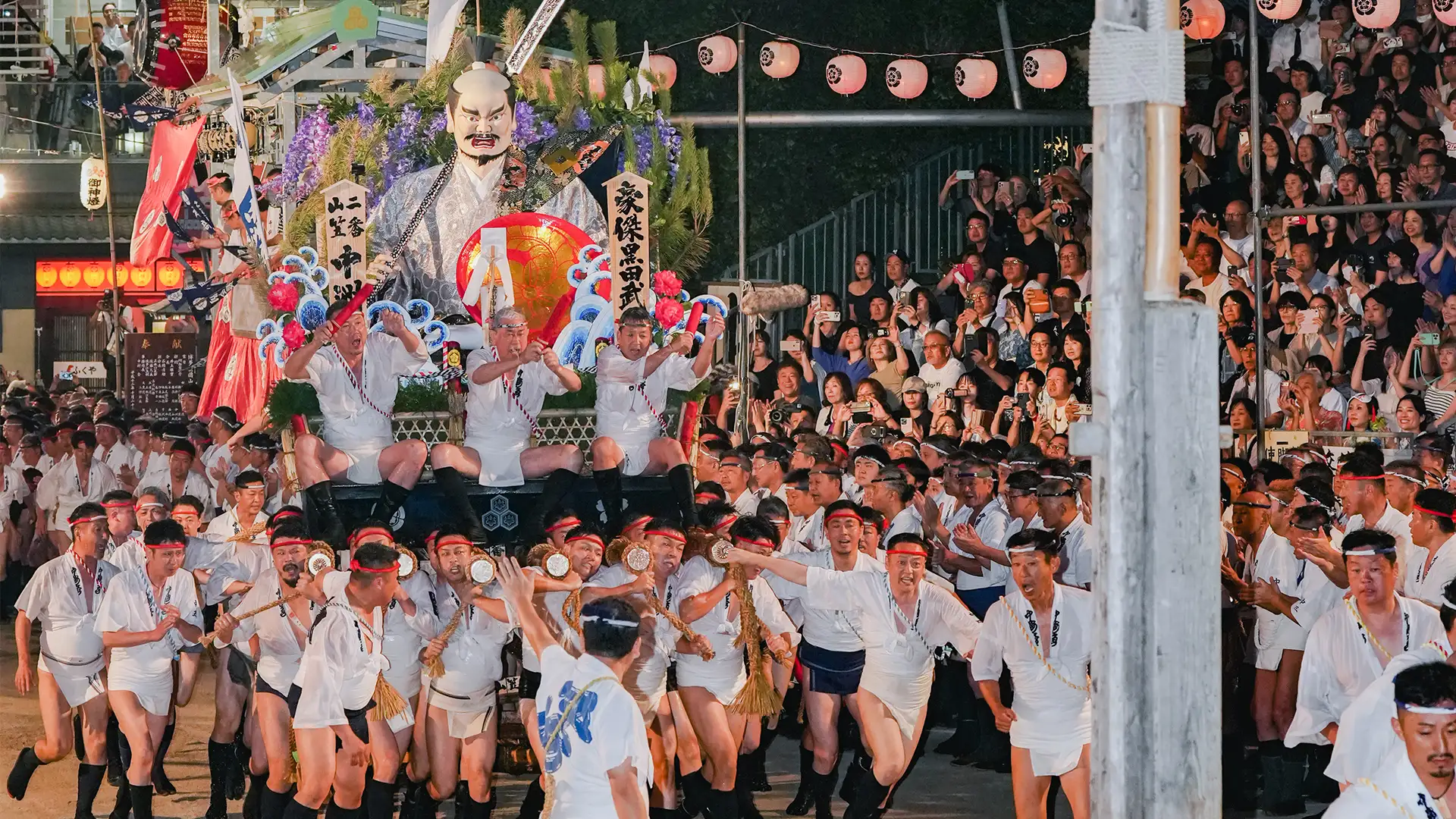 As dawn breaks and the sky shifts from black to orange, Yamakasa floats start entering Kushida Shrine one after another.